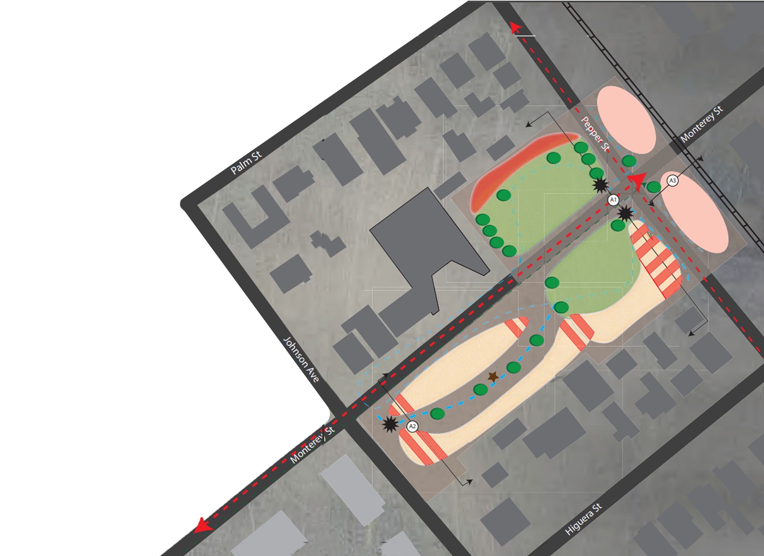 The site extends from the parking lot on the corner of Monterey and Pepper street, and goes through Monterey Street, ending at Johnson Avenue or the 7-eleven Parking Lot. In addition to the street section, a portion of the track would be considered for a light rail station. It should be noted that existing trees, regardless of their color coating, are to remain.